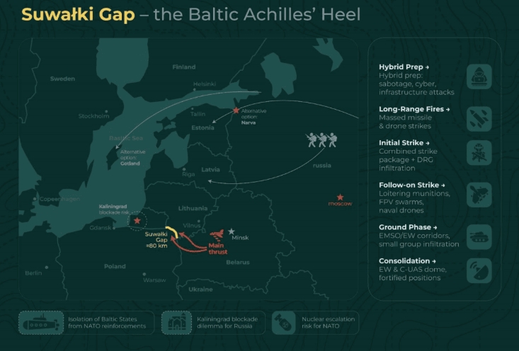 Een plotselinge Russische poging om een beperkt maar strategisch belangrijk gebied te veroveren, waarschijnlijk de 80 kilometer lange Suwalki-corridor tussen Kaliningrad en Belarus—, zou tot doel hebben de Baltische staten te isoleren van versterkingen op het land NAVO-bondgenoten. Dit zou een razendsnel offensief zijn, bedoeld om een voldongen feit te creëren voordat de NAVO een gecoördineerde reactie kan opzetten.